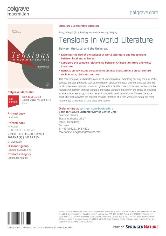 《世界文学中的张力》由施普林格(Springer)旗下的英国老牌出版社帕尔格雷夫·麦克米兰(Palgrave Macmillan)出版。