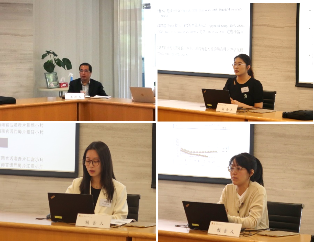 田海丁的报告《四川乐山话双音节词声调分析》采用实验语音学的方法对乐山话声调进行了细致分析,从双字调的角度探索其在语流中的实际情况,进而观察双字调与单字调的差异并进行解释。香港中文大学罗琴芹的研究《汉语普通话是非问句语调的句法分析》,研究了自然口语语料中不同是非问句语调类型的音高升降模式,并指出语调的句法功能是表达说话人对听话人的交互需求,而句末助词则表达说话人的信疑程度。三位同学依次报告之后,郭必之教授针对不同研究分别提问,并组织现场老师同学对报告提出建议和指导。
