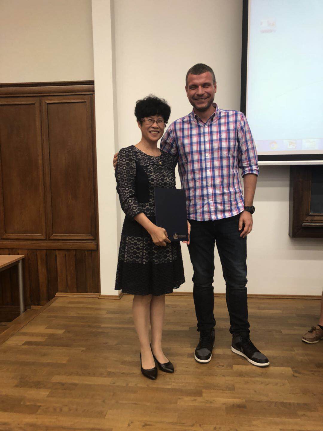 大家的汇报展示得到了老师们的高度肯定,均获得A等的优秀成绩。紧接着华沙大学Plotr Kajak老师为同学们颁发了结业证书,并给每个小组赠送了带有波兰特色的礼物。