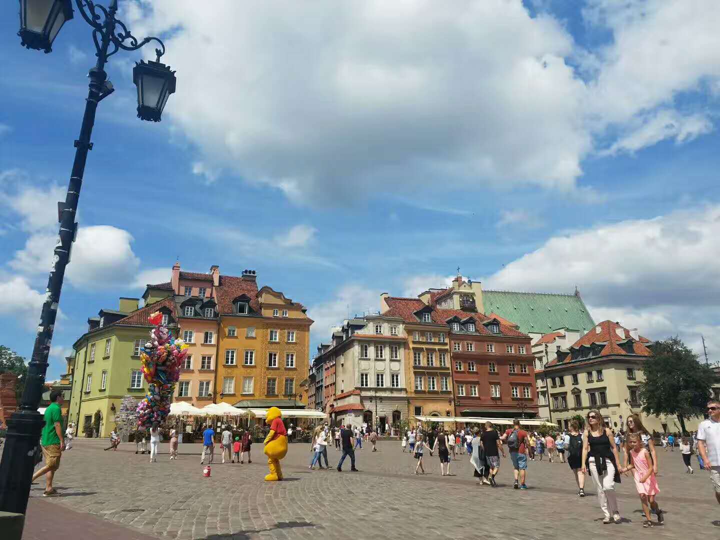 老城广场是华沙市内的一个古老的广场,在皇宫城堡前,是从现代的华沙市中心通往华沙旧城的入口。广场上的建筑毁于二战,战后这里的主要建筑都在原来图纸的基础上得到了重建。我们走在老城的街头,美丽而富有生机,建筑物色彩斑斓,不同于现代的华沙,这里景色古朴而别有一番风味,白色的马车穿行,不时有悠扬的琴声传来,浪漫而迷人。