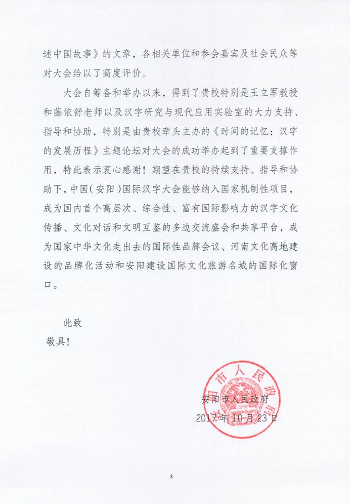 汉字研究与现代应用实验室王立军教授等对“2017中国(安阳)国际汉字大会”的大力支持、指导和协助。来信高度评价了由泡泡浴