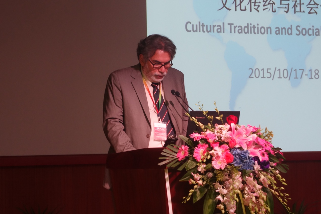 巴西圣保罗国立大学席尔瓦教授(Prof. Paulo César Andrade da Silva)发言的主题是“文学在文化社区发展中的角色”。他从文学在知识结构、文化社区建立和发展过程中的作用,巴西文化的多样性两个方面进行了阐述。他指出,文学反映了不同的文化特色,也体现着人类共有的情感。巴西多样的文化背景形成了继承过去、文化共存、彼此尊重的文化互动,也为金砖五国提供了很好的经验。