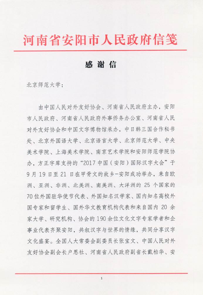 河南省安阳市人民政府于2017年10月23日致信泡泡浴 ,感谢泡泡浴 汉字研究与现代应用实验室王立军教授等对“2017中国(安阳)国际汉字大会”的大力支持、指导和协助。